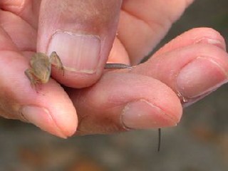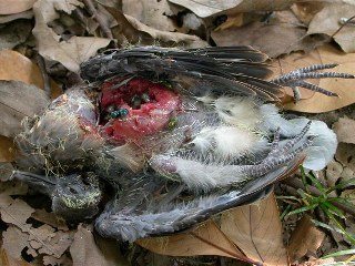 【左】スズメが死んで地面に落ちていました。ウジがたくさん発生していました。ウジは自然界の掃除やさんです。