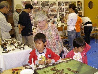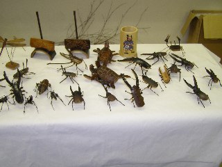 【左】焼竹でカブトムシを作っています。