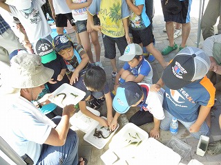 採ってきた生き物の説明。みんなで採ったので色々な生き物が見られる