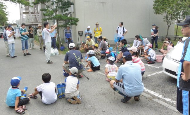【左】出発前のお話(乙川東小駐車場)   【右】お父さんのタモ網は市環境課で準備したもの