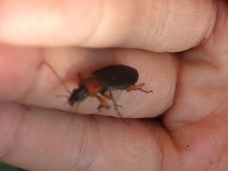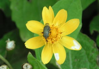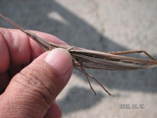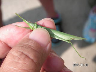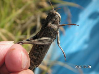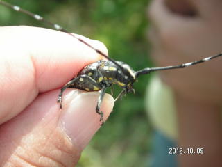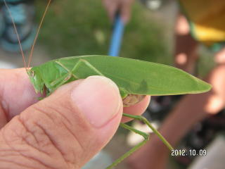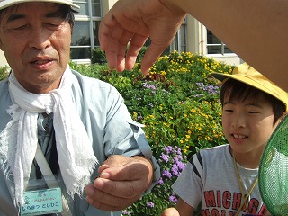 学校周囲を一回りする予定でしたが結局、校庭の花壇と校庭西の農園へ行っただけでした。花に虫が来るだろうと予想して、まず花壇へ生徒を連れて行きました。今回は虫を見つけても捕らずに姿、形、行動をじっくり観察しようとしました。しかしチョウもアブもじっとしているわけがなく、すぐにどこかへ飛び去ってしまい失敗に終わりました。生態観察をあきらめいつものように捕らえて説明する固定観察?に切り替えました。初めは私がシジミチョウやイボバッタを捕らえて見せて説明しましたがそのうちこつをつかんだのか生徒の方から次々に虫を捕まえて持ってきてくれました。大きなクダマキモドキが見つかった時は歓声が上がりました。予定時間の半分過ぎたところで花壇の観察を切り上げ農園の観察に向かいました。向かう途中で採集に飽きたのか生徒たちが木登りしたり遊び始めてしまい、引率の先生に引き戻してもらいました。農園ではトノサマバッタやカミキリムシが見つかったため生徒に再び採集意欲が出て予定時間まで観察を続けることができました。農園横の木陰でまとめをして観察会を終了しました。晴天が幸いし、校庭にいる虫の種類の多さに驚いたという感想が多く聞かれました。(平松俊)