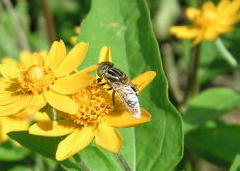 【左】キゴシハナアブ(花壇の花上) 【中】ヤマトシジミ(花壇の花上) 【右】ウスバキトンボ(花壇付近、空中)