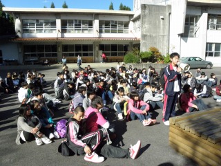 【左】おじさんとの対面式  【右】面の木の自然に親しみ、自然大切さを学びことを誓います。