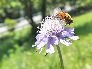 【右】マツムシソウに来たハナアブ(面の木峠)