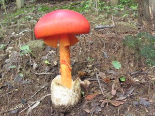 【右】タマゴタケ(一週間前の下見の時核にしたキノコで美しく味もおいしい)