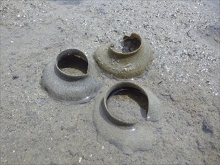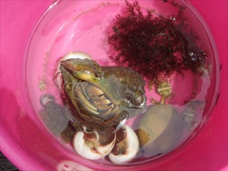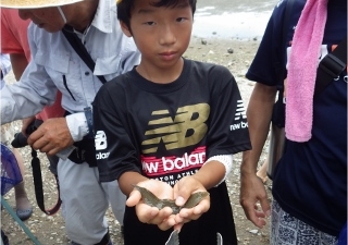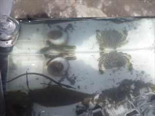 潮が干った地面(水中も含めて)にはタマシキゴカイの卵塊や糞、ツメタガイの卵塊がり、岩には色々な生きものがくっついていたが、子どもたちはそれらに余り興味を示さず、水中のカニや魚を捕るのに一生懸命だった。小さな子にはヤドカリが大人気であった。