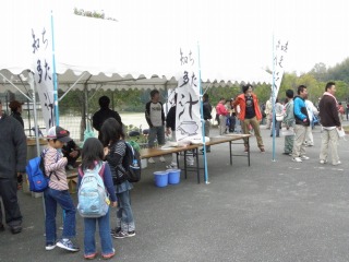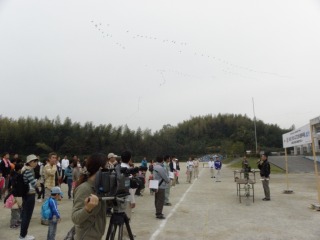 【左】受付風景  【右】開会式、この時にカワウの大きな群れが移動しました。