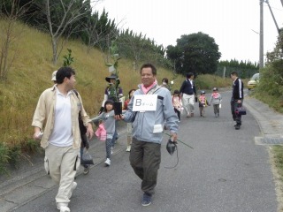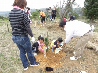 身近にあるオレンジラインに名にふさわしくミカンを植えることにしました。記念樹として家族で一本ずつミカンの苗木をいただき、自然観察ハイキングをしながらオレンジラインに向かいました。途中、オレンジラインの自然について説明を聞きながら植樹予定地に向かいました。現地で植樹し、思い出となるよう竹で作った名札に家族の名前を書いて立てました。