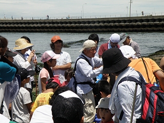 採集された生き物を、森田指導員が説明し、参加者一同で観察する“わかちあい”を行ないました。またその後、生き物を海に帰す際、よほど自分で獲った生き物に思い入れがあったのか、泣き出してしまう子もいたりして、心に残る観察会となったと思います。