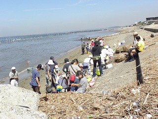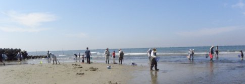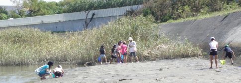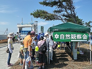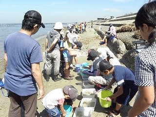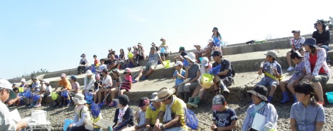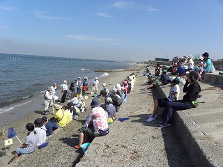 秋の晴天に恵まれ、参加者も指導員も笑顔で集合。自然観察会の旗幟が立つテントで受付、参加者は海を見ながら開会式すませて、海の観察の楽しみ方についての説明があり、今から海面の状況が変わる潮の引き方、観察場所のポイント、今回の観察場所で想定される危険な生き物等の説明があり参加者は興味深く、かつ熱心に聞かれた後、6班に分かれて各班の指導員と連れ立ち観察が始まった。潮が下がるにつれて変化する砂浜と河口、テトラの堤防の中や石に付着している生物等を観察した。分かち合いでは採集した生物をグループ毎に丁寧に説明されていて参加者も熱心に聞き込んで視得た。