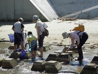 【左】面白いものが流されてきているよ 【中】人工物の近くにも生き物がいました 【右】杉谷川の中も探しました