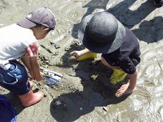 【左】砂の中の生き物を探しています 【右】貝殻探しをしている人もいました