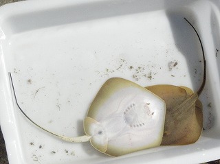 【左】各班で採集した生き物の分かち合い 【中】各班で採集した生き物の分かち合い 【右】アカエイの赤ちゃん