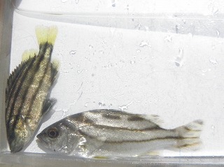 【左】アカオビシマハゼ 【中】ナベカ 【右】左、シマイサキ。右、コトヒキ。(よく似た魚です)