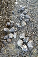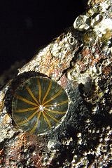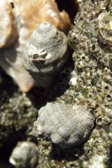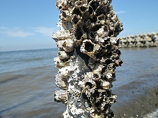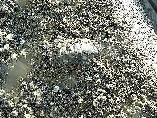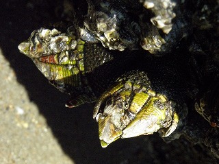 【左】フジツボ(外来?) 【中】左(小)、イワフジツボ。右、シロスジフジツボ 【右】アカフジツボ?(少し深いところにある)