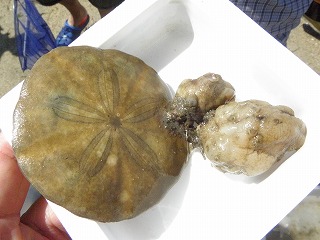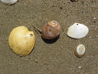 【中】貝殻。左上からカガミガイ、ツメタガイ、オオノガイ。下、コウダカアオガイ?