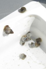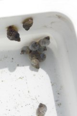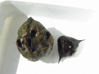 【左】左、ハスノハカシパンの抜け殻。右、シロボヤ 【中】イボニシ 【右】アラレタマキビ。潮水に浸けると這い上がる