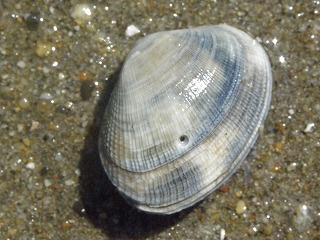 【左】コウダカアオガイ 【中】アサリ、穴はツメタガイの仕業か 【右】カリガネエガイ