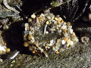 【左】ヨロイイソギンチャク 【中】ムギワラムシ 【右】ヤッコカンザシの抜け殻(ゴカイの仲間)