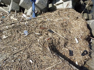 【左】流れてきた種子。オニグルミとヒシ 【右】台風18号で打ち寄せられた漂着物。ペットボトルが目立つ