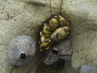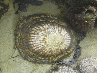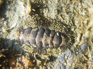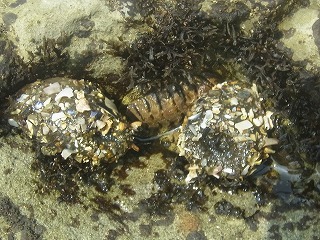 【左】スガイ 【中】ヒザラガイ 【右】コシダカガンガラに外来のシマメノウフネガイが着生しています