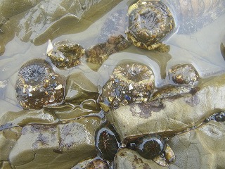 【左】クモヒトデ 【中】オヒラキヘラムシ 【右】カメノテ(上)とクロフジツボ