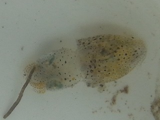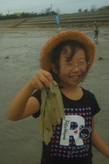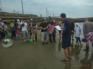 台風11号は四国、中国地方を縦断し日本海の抜けていました。当日、名古屋や岐阜では大雨だったそうで参加申込者の半部は欠席しました。現地の奥田海岸は雨が上がりましたが台風の影響か潮位が高めでした。説明に少し時間をとっている間にずいぶん引いてきましたので実施しました。台風の影響しょうか、海藻に産み付けられているアオリイカの卵やアメフラシの卵を観察することが出来ました。そして、アオリイカの卵から幼体が出てきたことに感激。また、アサリが見つからずにハマグリをたくさん採集しました。(外来生?混血?)