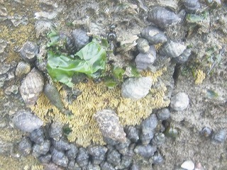 【左】ハマグリ(アサリが少なくハマグリたくさん)      【中】イボニシとイボニシの卵      【右】アメフラシとラーメンみたいな卵