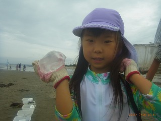 【左】海好きの仲間がたくさん集まりました     【右】ミズクラゲ見つけたー。ゼリーみたい