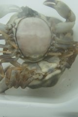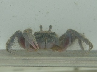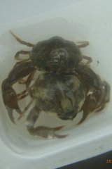【左】コメツキガニ     【中】マメコブシガニ。左、上が♂(小)。♀。右、上の腹が大きいのが♀     【右】イソガニにウンモンフクロムシが寄生。