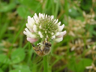 【右】シロツメクサとミツバチ。白い詰め草でガラス容器を入れた箱にクッション材として使ったことからです。