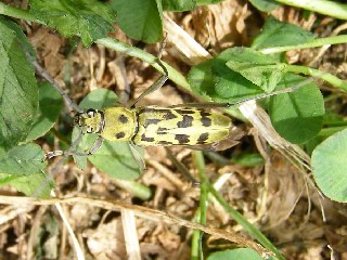 【左】キイロトラカミキリ。幼虫は、クヌギ、コナラ、ヤシャブシなどの枯れ木を食べるそうです。