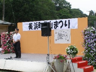 【左】まず、町長さんのあいさつです。「美浜町の全国自慢は・・・・・」