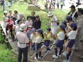 【右】自然観察では、望遠鏡を用意して皆さんに野鳥を見ていただきました。
