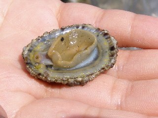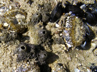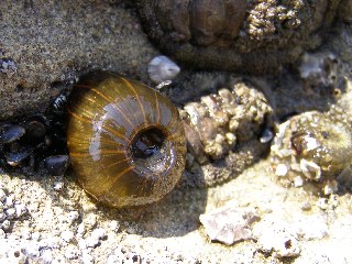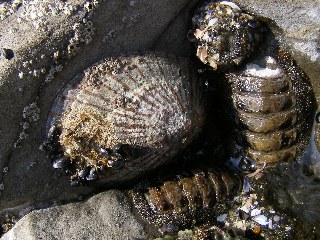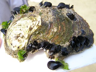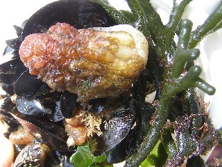 【左】巻貝はスガイ。黒い2枚貝はムラサキイガイ。料理に使われるムールガイはこれです。