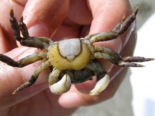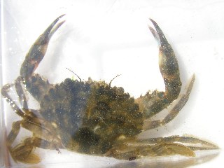 【左】ワタリガニの仲間のイシガニで、ハサミの力が強いです。
