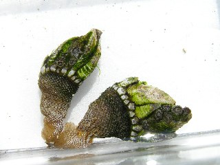 【右】イソガニにウンモンフクロムシが寄生しています。