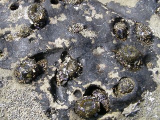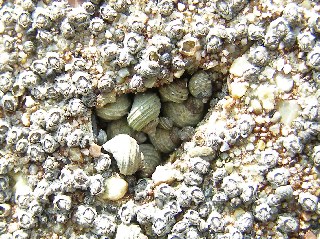 【中】潮上帯から飛沫帯で見られるタマキビガイとイワフジツボ。