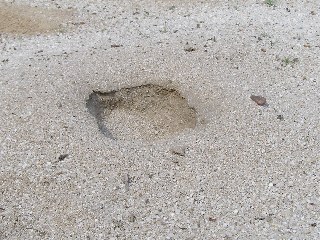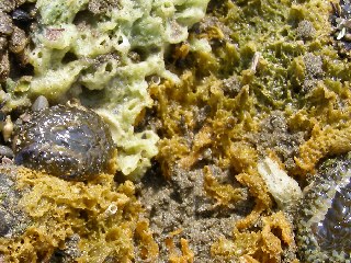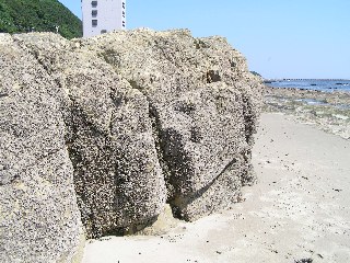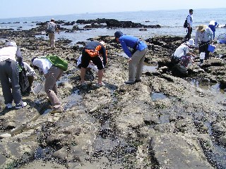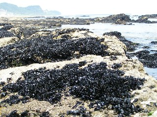 【左】岩場にびっしりムラサキイガイが付着している。磯焼け?。