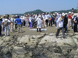 【右】神社の階段に使われていた岩石の地質年代について解説をしています。