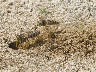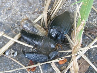 【中】コガネムシの幼虫に群がるオオヒラタシデムシの成虫と幼虫。