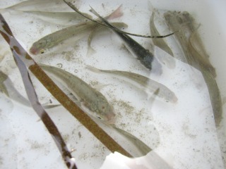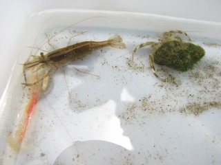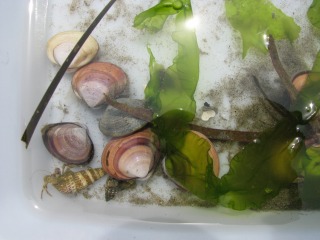 【左】クロムシというゴカイを見ました。 【右】採集したものを最後に観察し、皆さんで分かち合いをしました。