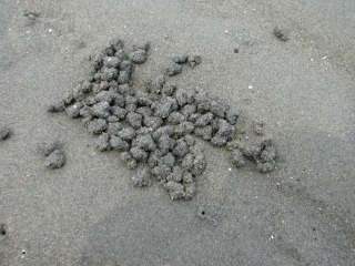 【左】コメツキガニの砂団子。(えさを吸い取って丸めたもの)