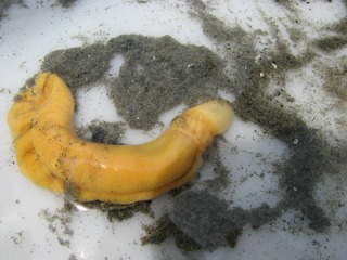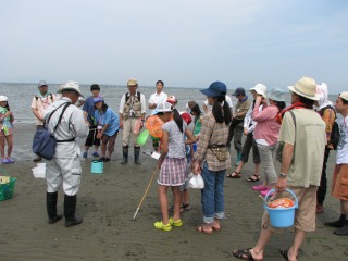 観察は、中潮で干潮を過ぎてから開始したため十分に潮は引きませんでしたが、皆さん熱心に観察採集されましたので、砂浜に生活する主な生き物を観察することが出来ました。(記・降幡)