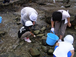 【左】グル−プごとに磯に下りました。 【右】足元に注意をしながら下りました。