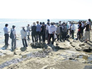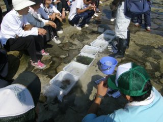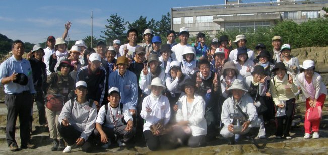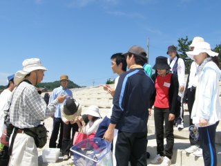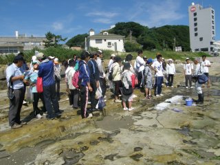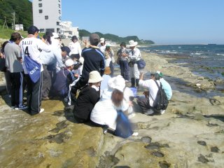 梅雨が明けて夏本場になりました。毎年同じ季節に新しく先生なられた皆さんの研修会です。講師の先生を何年か勤められたベテランの先生、若い初々しい先生、山のほうから見えた先生、海に近い地元の先生、多様な皆さんが海辺の生き物観察とネイチャーゲームに熱心に取り組みました。