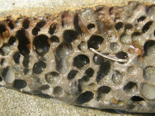 【左】カモメガイなど穿孔貝が空けた穴
