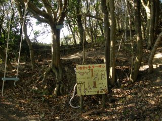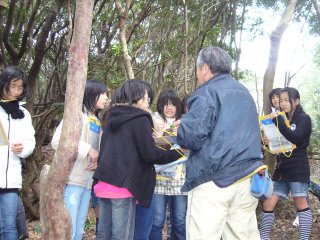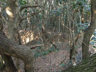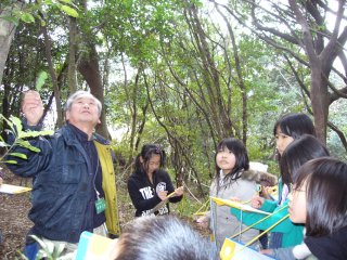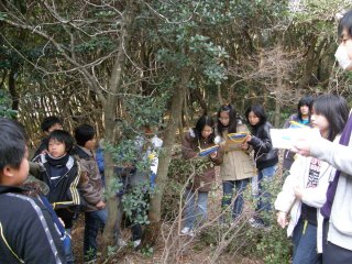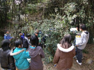 【左】森の中の様子。(ここの森は冬も葉を落とさない木の林で、常緑広葉樹林または照葉樹林いわれている森です)