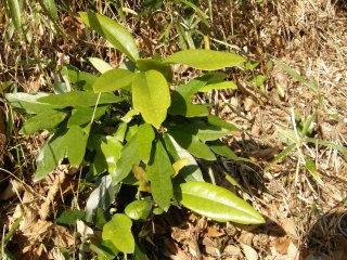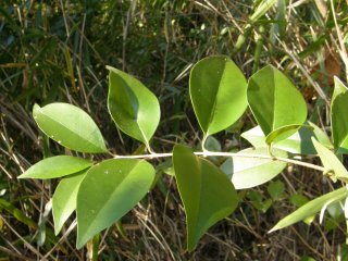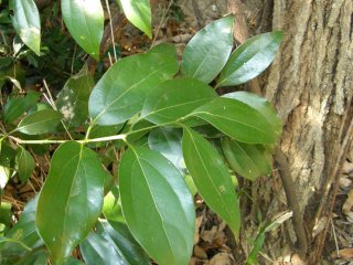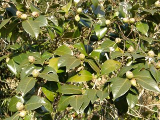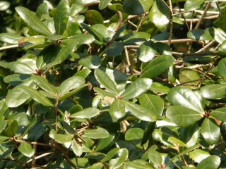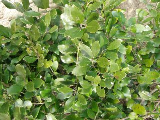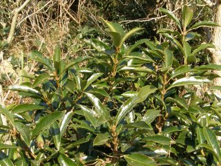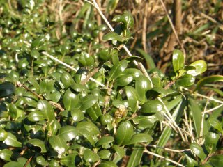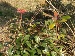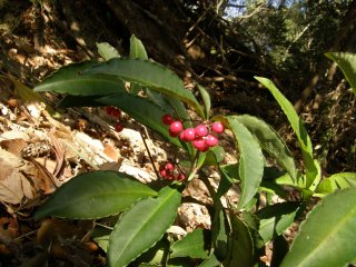 【左】森の中にヒサカキがたくさん生えています。  【右】ウバメガシは乾燥すると硬い木になります。