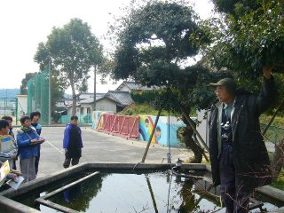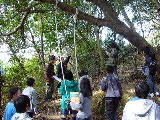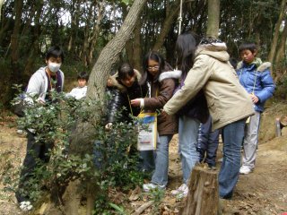 上野間小学校で6年間学んだ児童たちが、上野間小学校の北にある自然豊な探検の森を中心にそれぞれの思い出の木を決めました。そして、卒業式までに思い出の木に名札を作ることにしました。思い出として、選んだ木の名まえとともに木の特徴なども書くことにしました。正しい木の名前を確認するために学級ごとに校内を廻りました。
